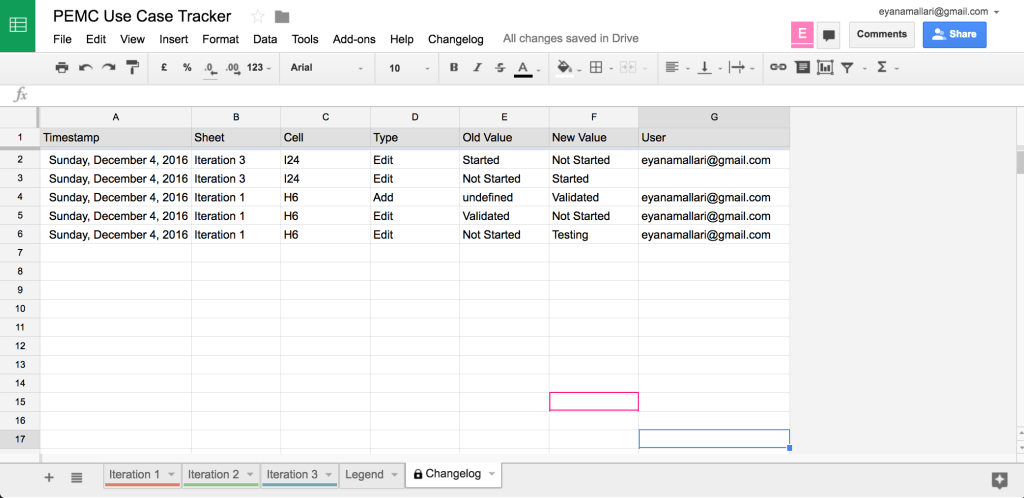 Did some cleaning up of the Changelog by deleting the extra columns, setting the header row as frozen, customizing the widths of some columns, and protecting the sheet.